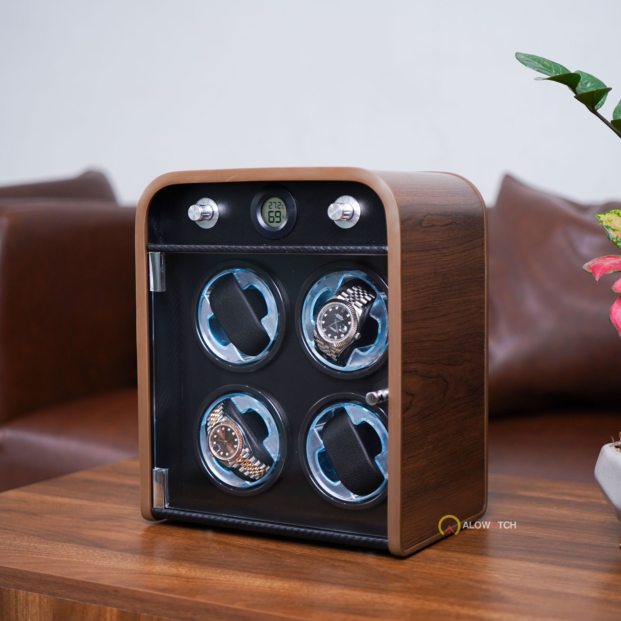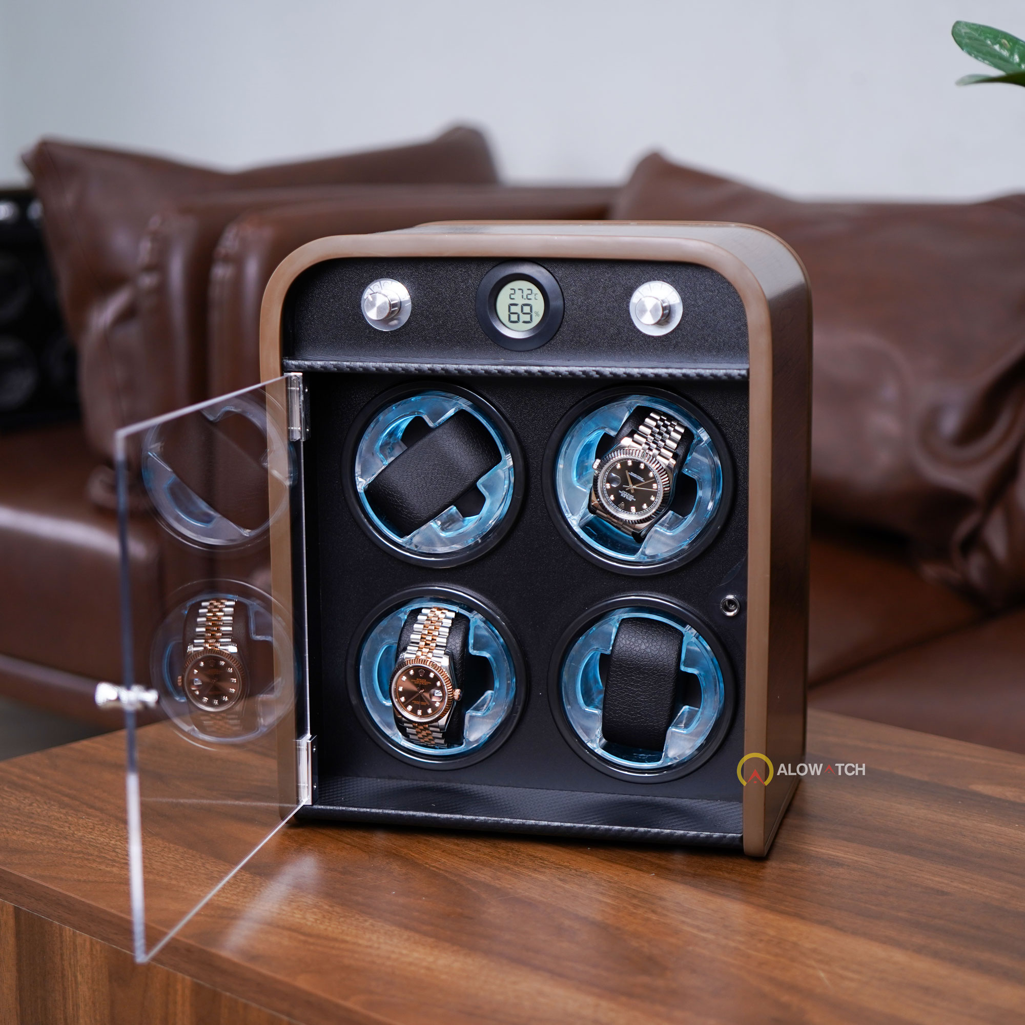 Chiếc hộp xoay đồng hồ trong hình là loại hộp xoay 4 ngăn, chuyên dùng để bảo quản và nạp cót tự động cho các dòng đồng hồ cơ.