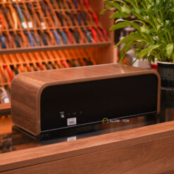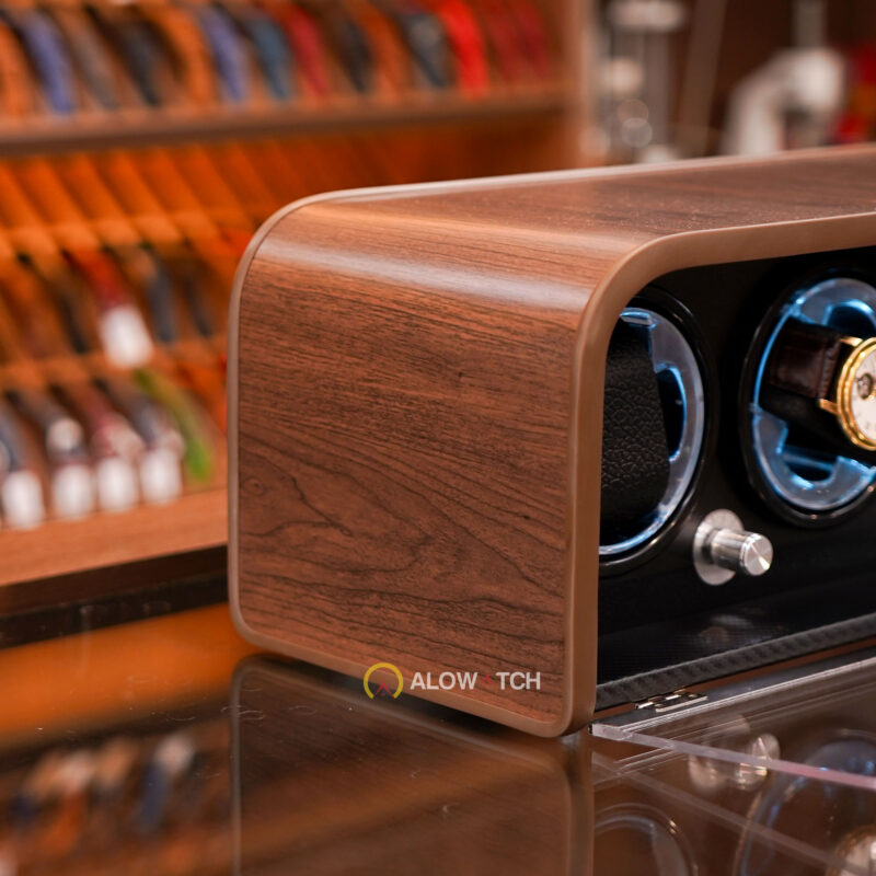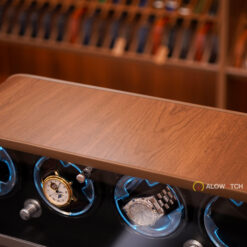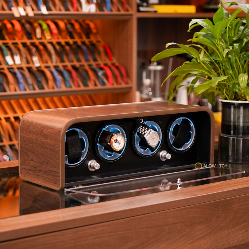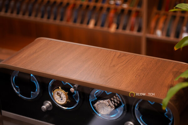 Bên trong hộp gồm 4 ổ xoay độc lập, có thể đặt được 4 chiếc đồng hồ cơ cùng lúc. Mỗi ổ xoay được viền LED xanh, tạo hiệu ứng ánh sáng nổi bật, khiến đồng hồ thêm phần lung linh khi trưng bày. Các gối đệm bọc da mềm giúp giữ chặt đồng hồ, tránh rung lắc và trầy xước khi vận hành.