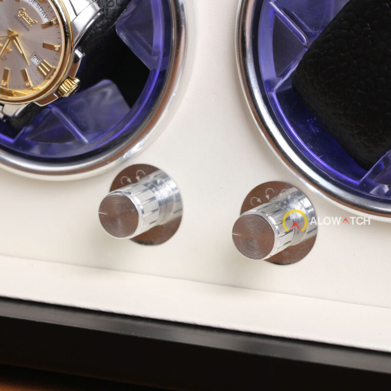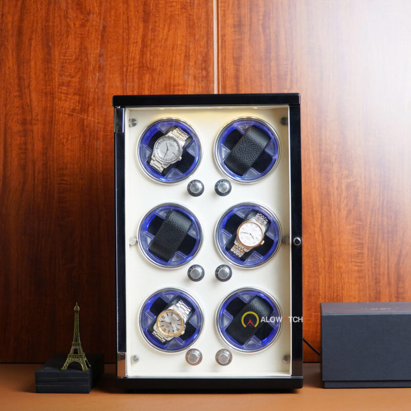 Bên trong hộp có 6 ổ xoay độc lập, cho phép lên cót tự động cho 6 chiếc đồng hồ cơ cùng lúc. Mỗi ổ xoay trang bị gối cao su non mềm, ôm sát dây đồng hồ, không gây trầy xước và phù hợp cho cả dây da lẫn dây kim loại. Phía ngoài có 6 núm điều chỉnh, dễ dàng cài đặt chế độ xoay riêng biệt cho từng ổ.
