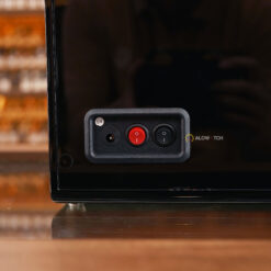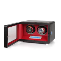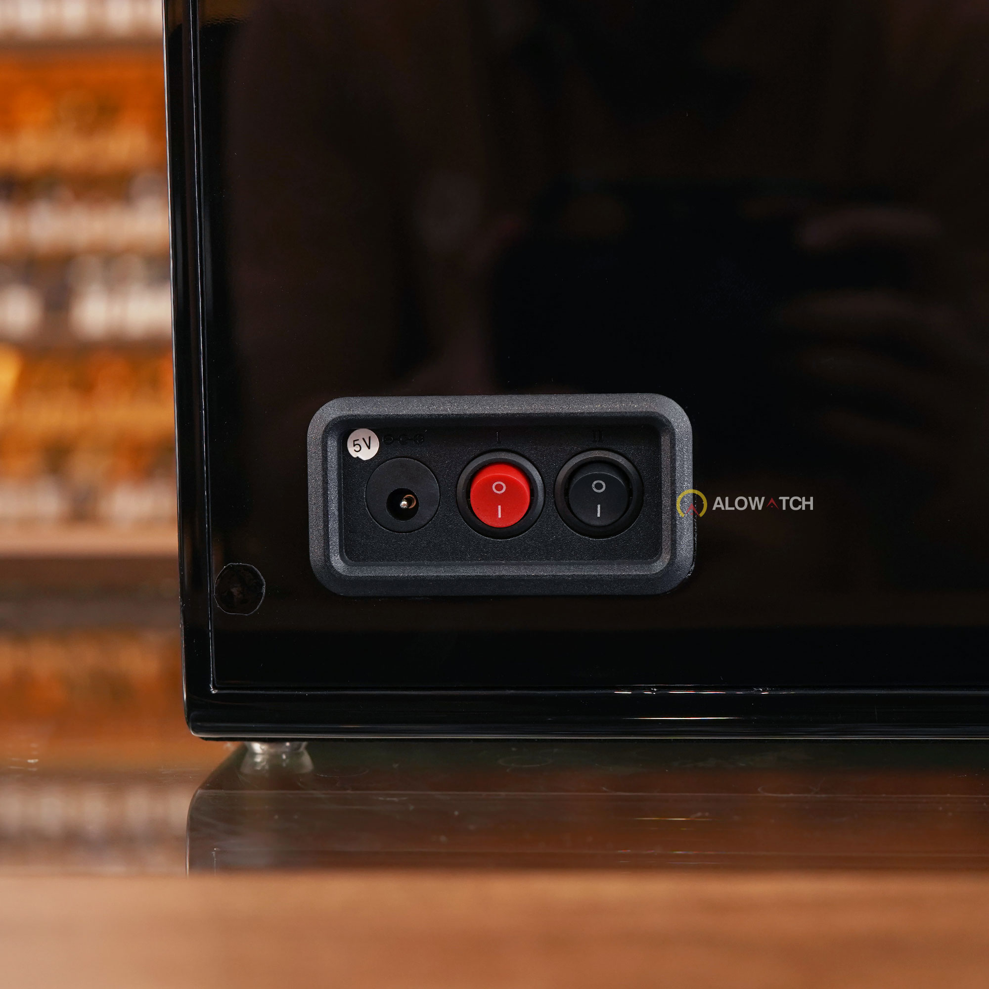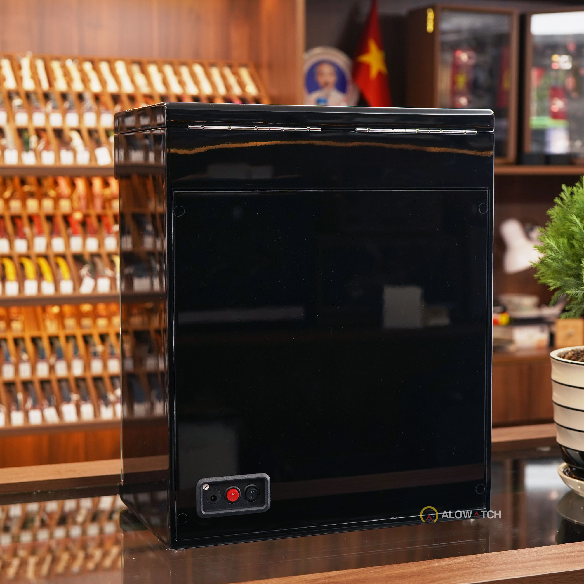 Hộp có thiết kế dạng tủ đứng hình chữ nhật, vỏ gỗ phủ sơn piano đen bóng sang trọng, mặt trước là cửa kính trong suốt giúp trưng bày đồng hồ như một vật phẩm nghệ thuật. Nội thất bên trong có thể chọn màu đỏ hoặc đen, phối hợp đèn LED chiếu sáng tinh tế, làm nổi bật từng chi tiết của đồng hồ.