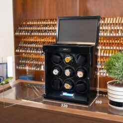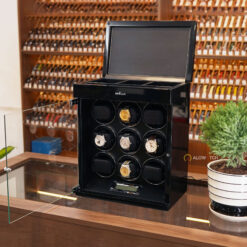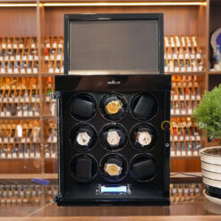 Bên trong gồm 9 ổ xoay độc lập, có thể đặt và lên cót tự động cho 9 chiếc đồng hồ cơ cùng lúc. Mỗi ổ xoay trang bị gối da, giúp ôm sát dây đeo, chống rung lắc và tuyệt đối không gây trầy xước cho đồng hồ.
